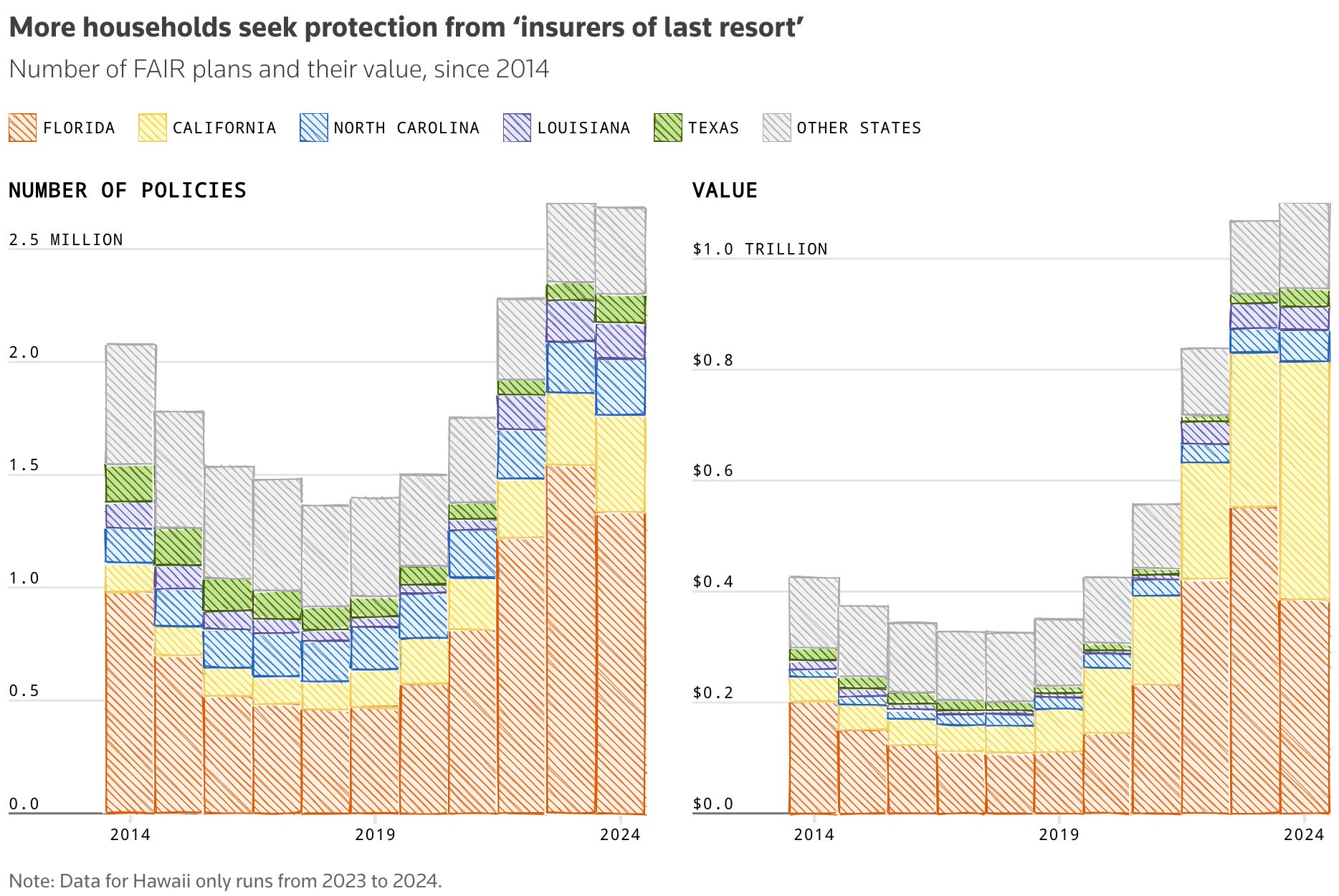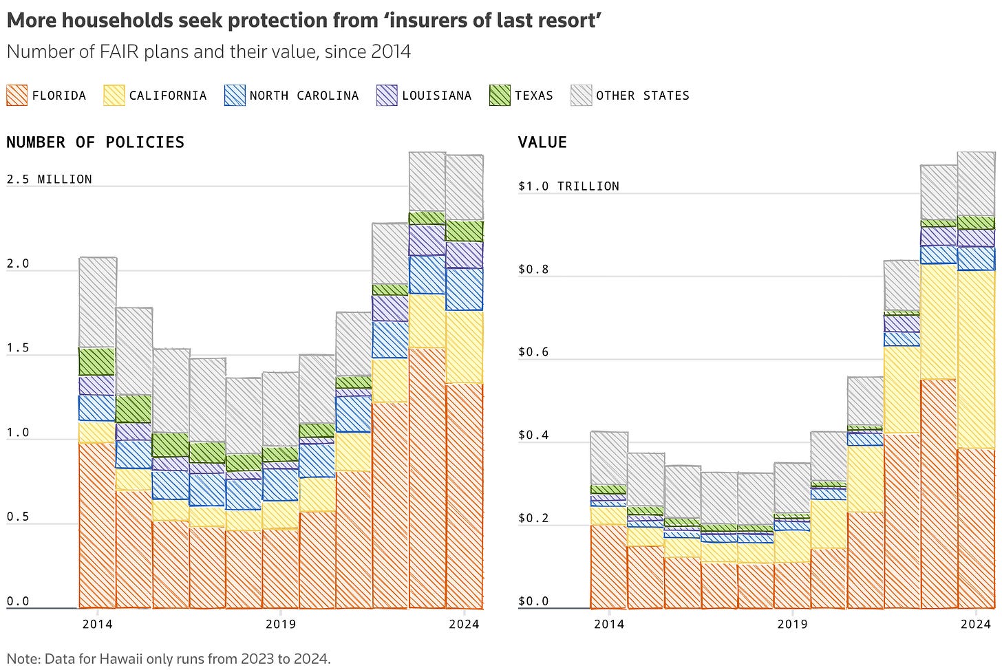 Until a couple of years ago I had no idea that home insurance was such a big problem in the US. By which I mean 1) it’s expensive, and rising 2) because of 1, many homeowners are choosing to go without, and then losing their homes to natural disasters. So this is interesting: “FAIR plans were designed as a stopgap measure, but as climate change fuels stronger disasters, these insurers are increasingly relied on.”